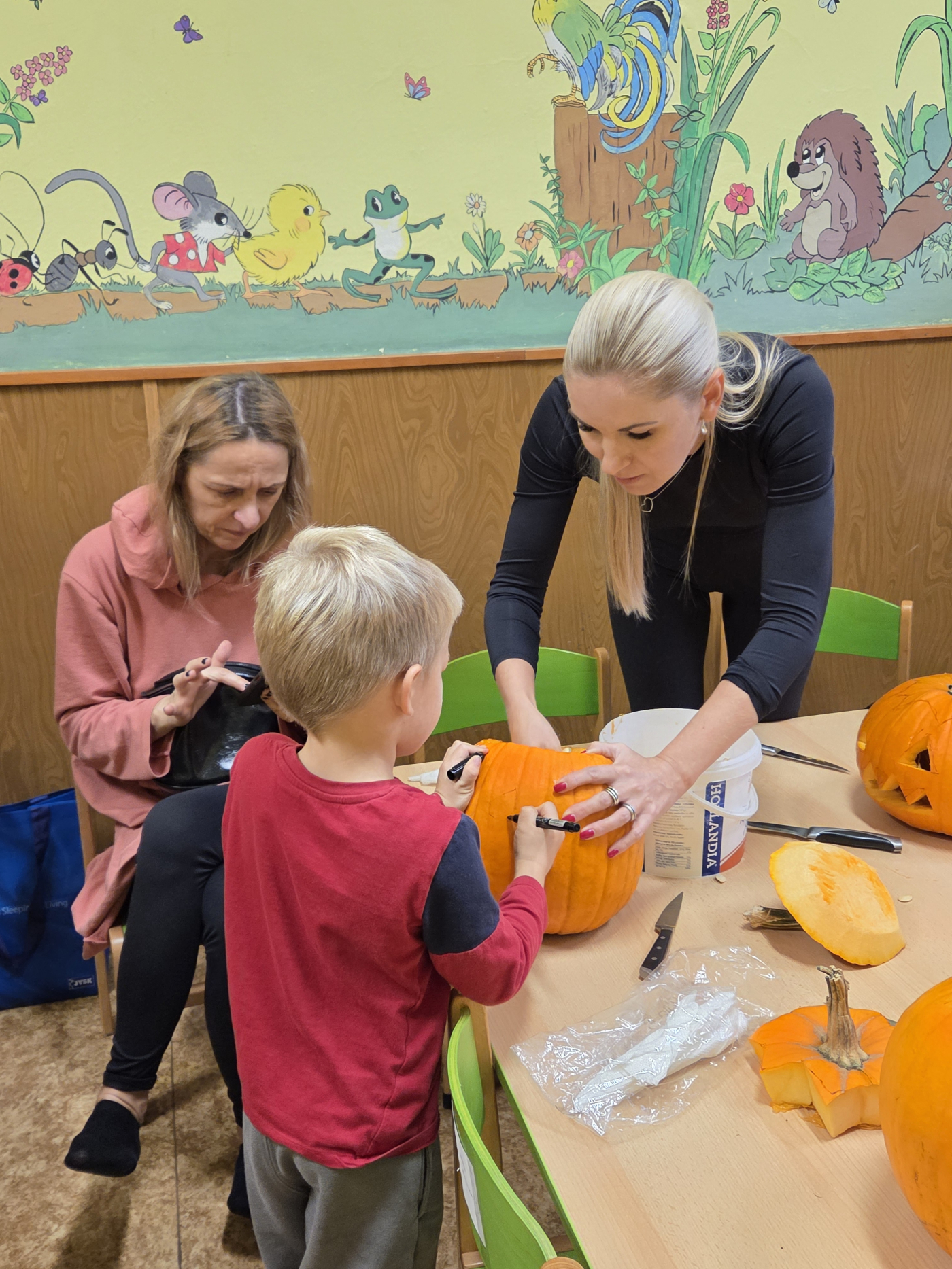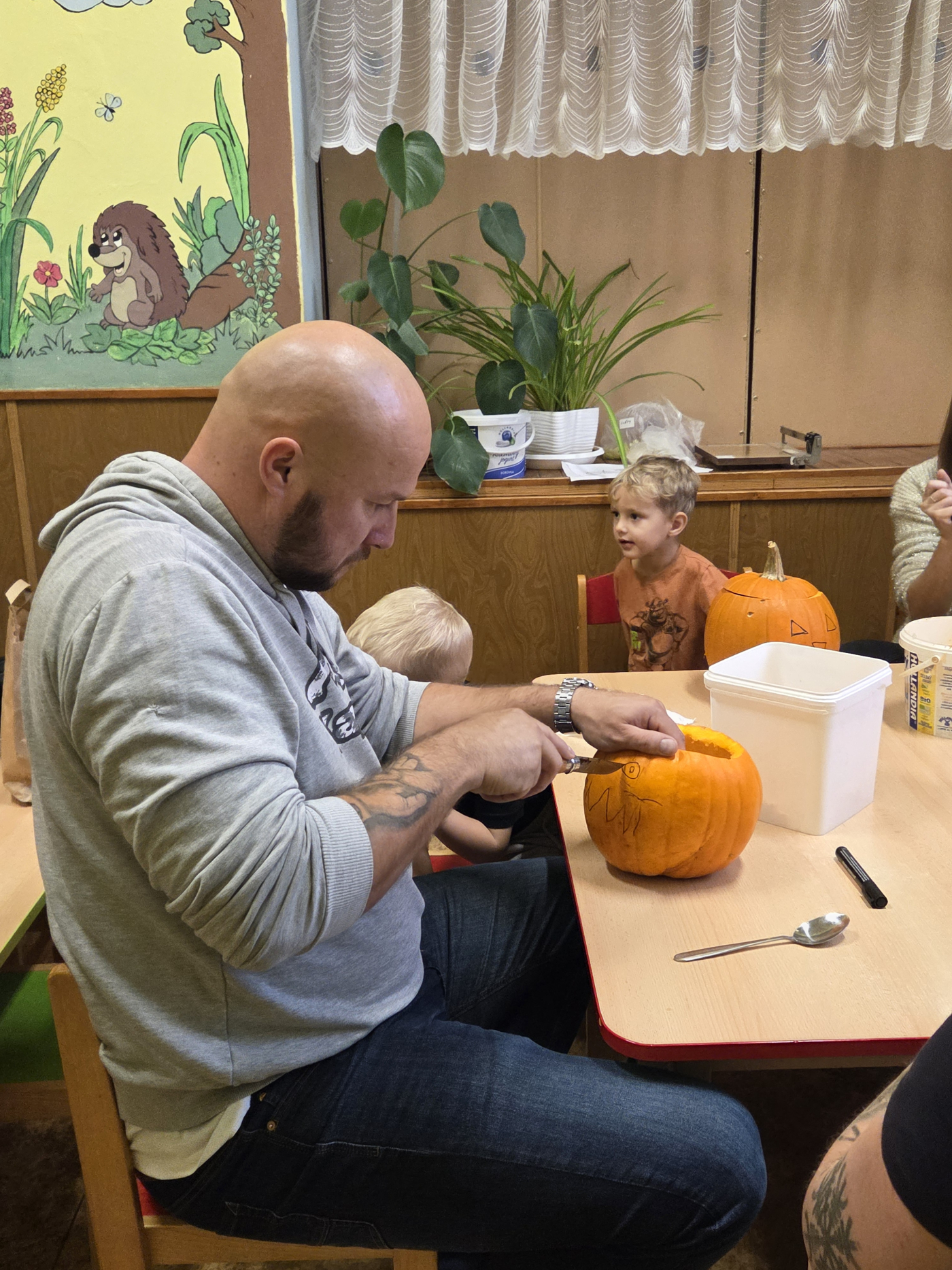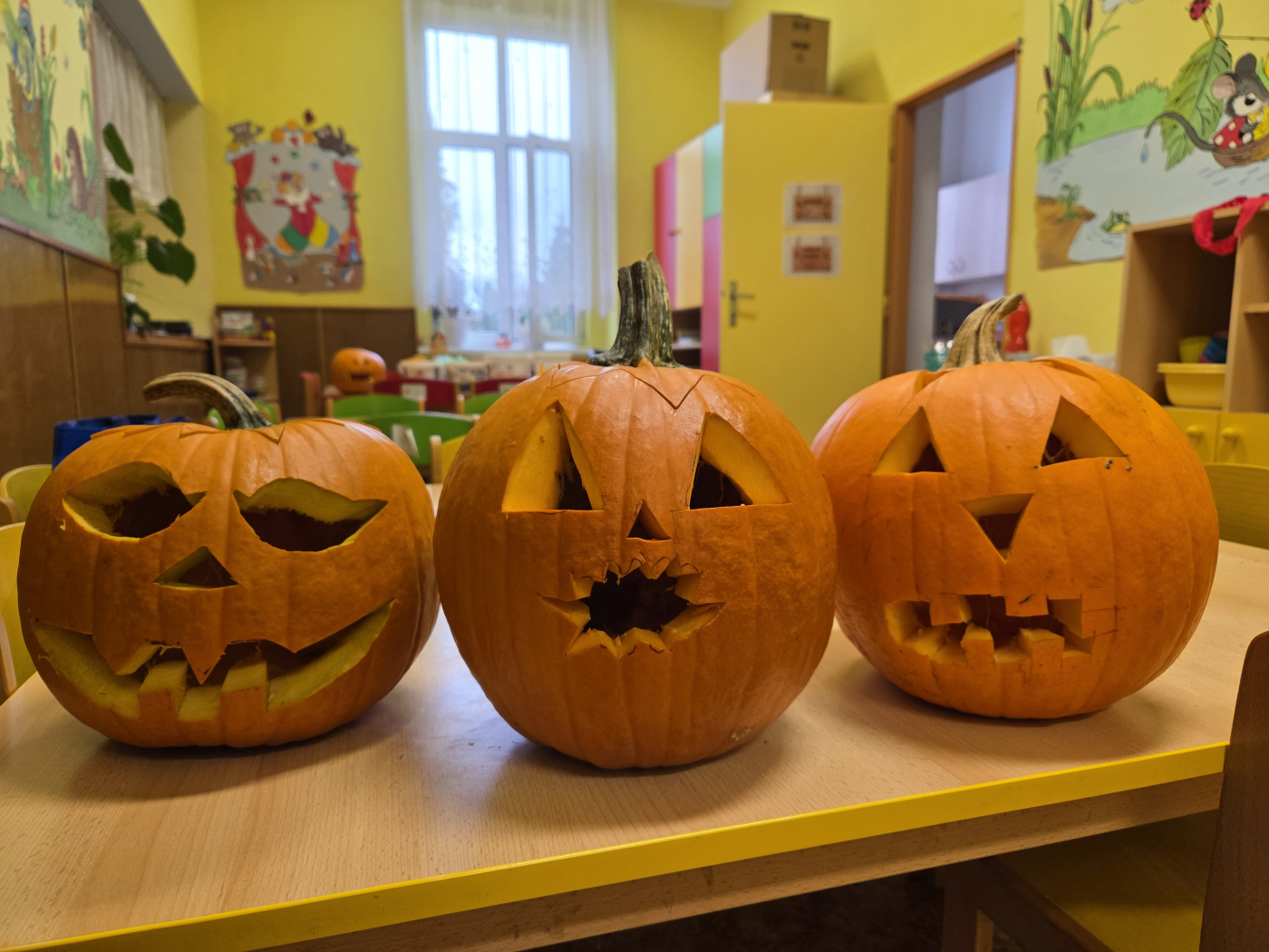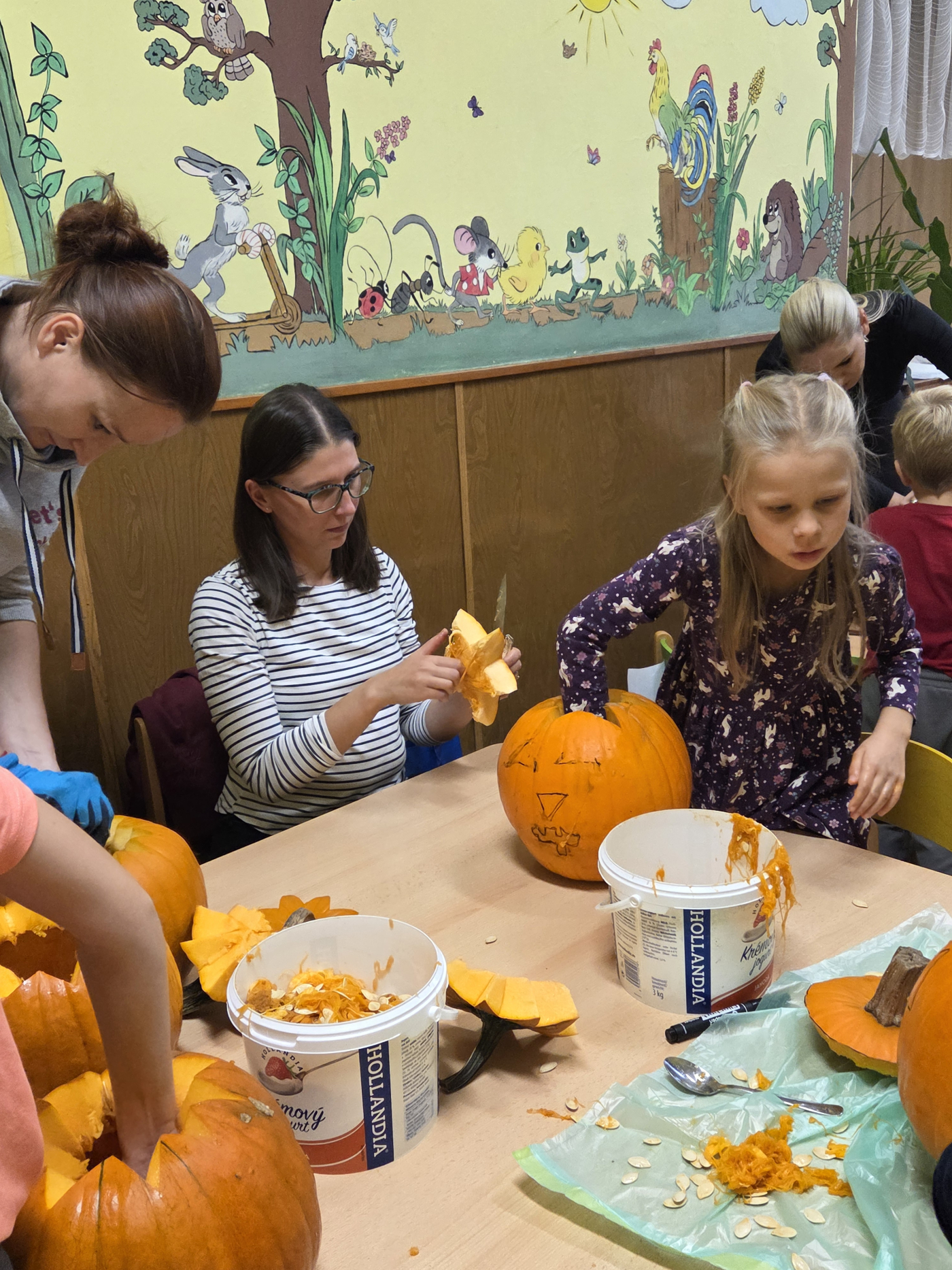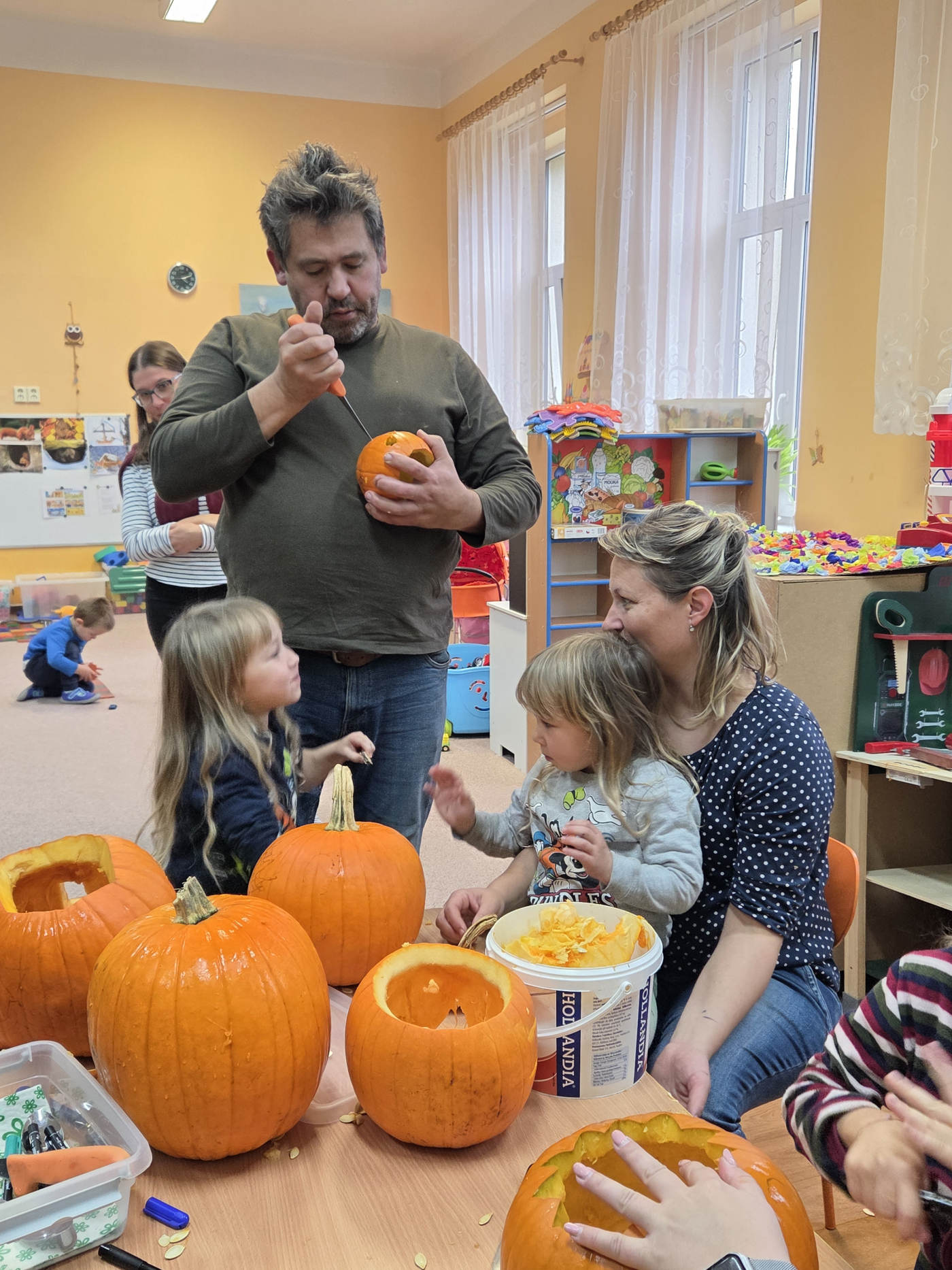 Středa 22. 10. patřila dýním. Ve školce se sešly děti se svými rodiči a sourozenci a všichni se pustili do dlabání dýní a vytváření strašidelných i veselých obličejů a dýňových postaviček. Všem se moc povedly a některé dýně zdobí i naši školku.