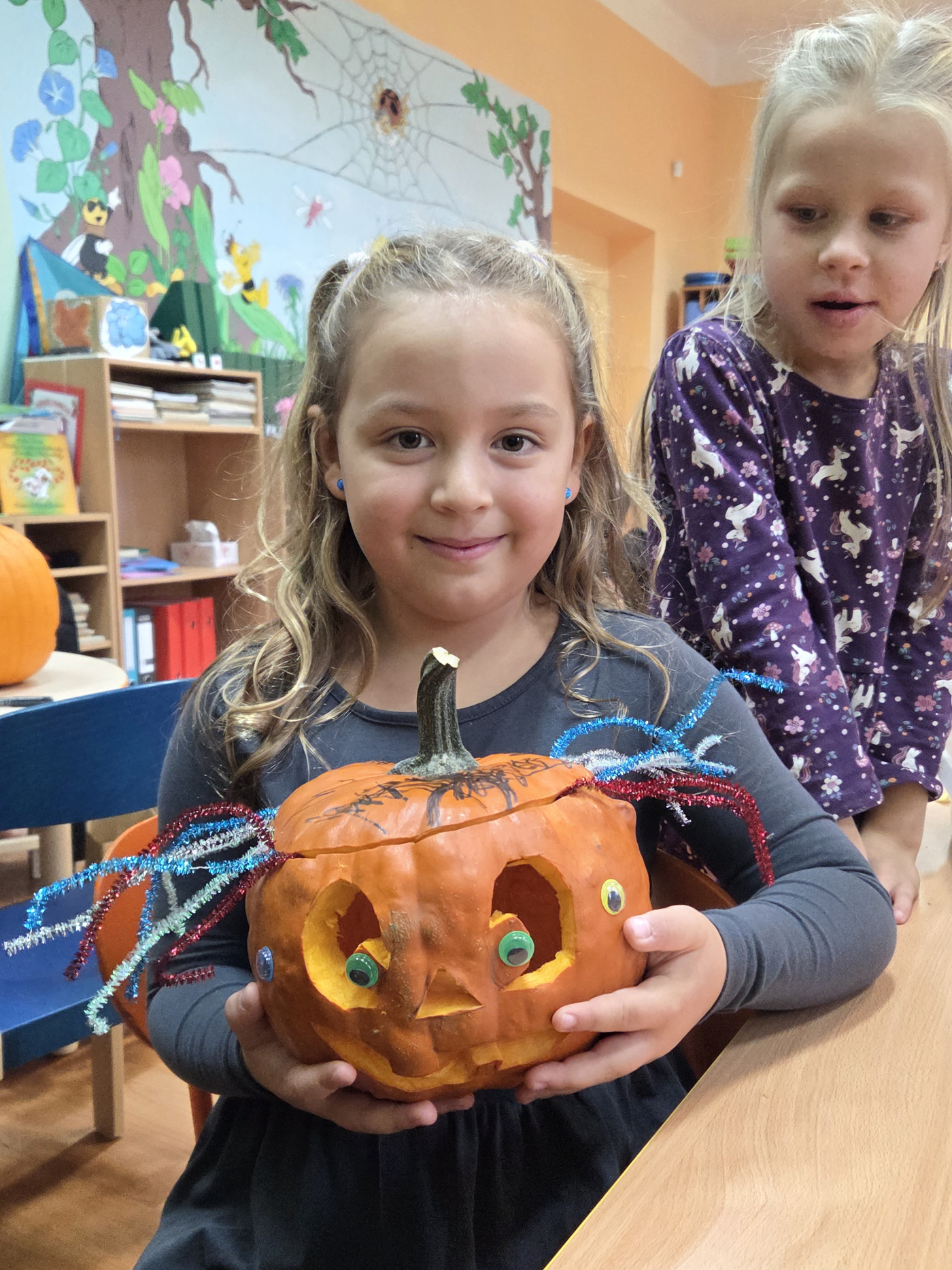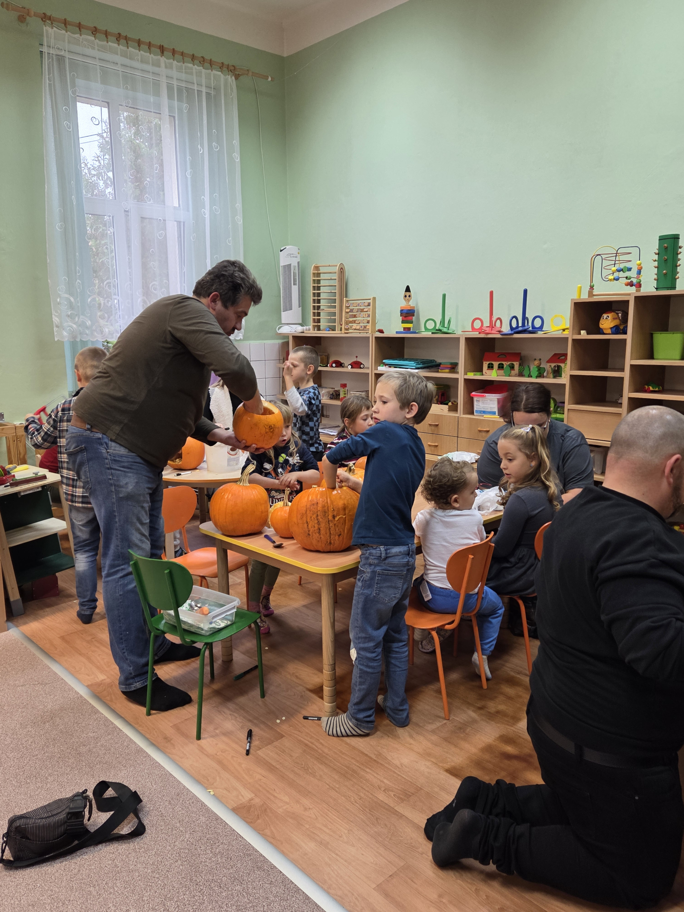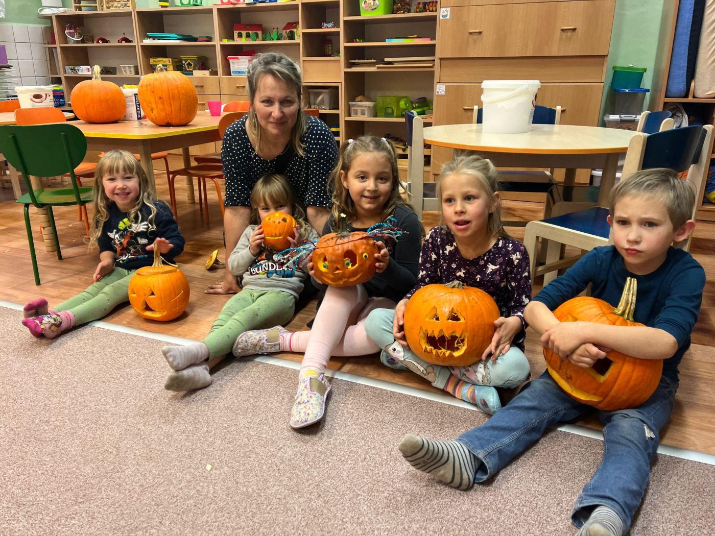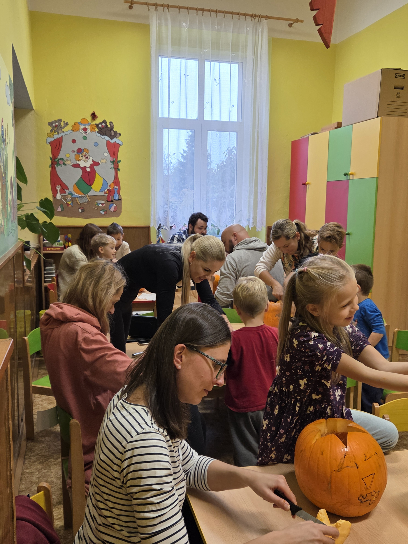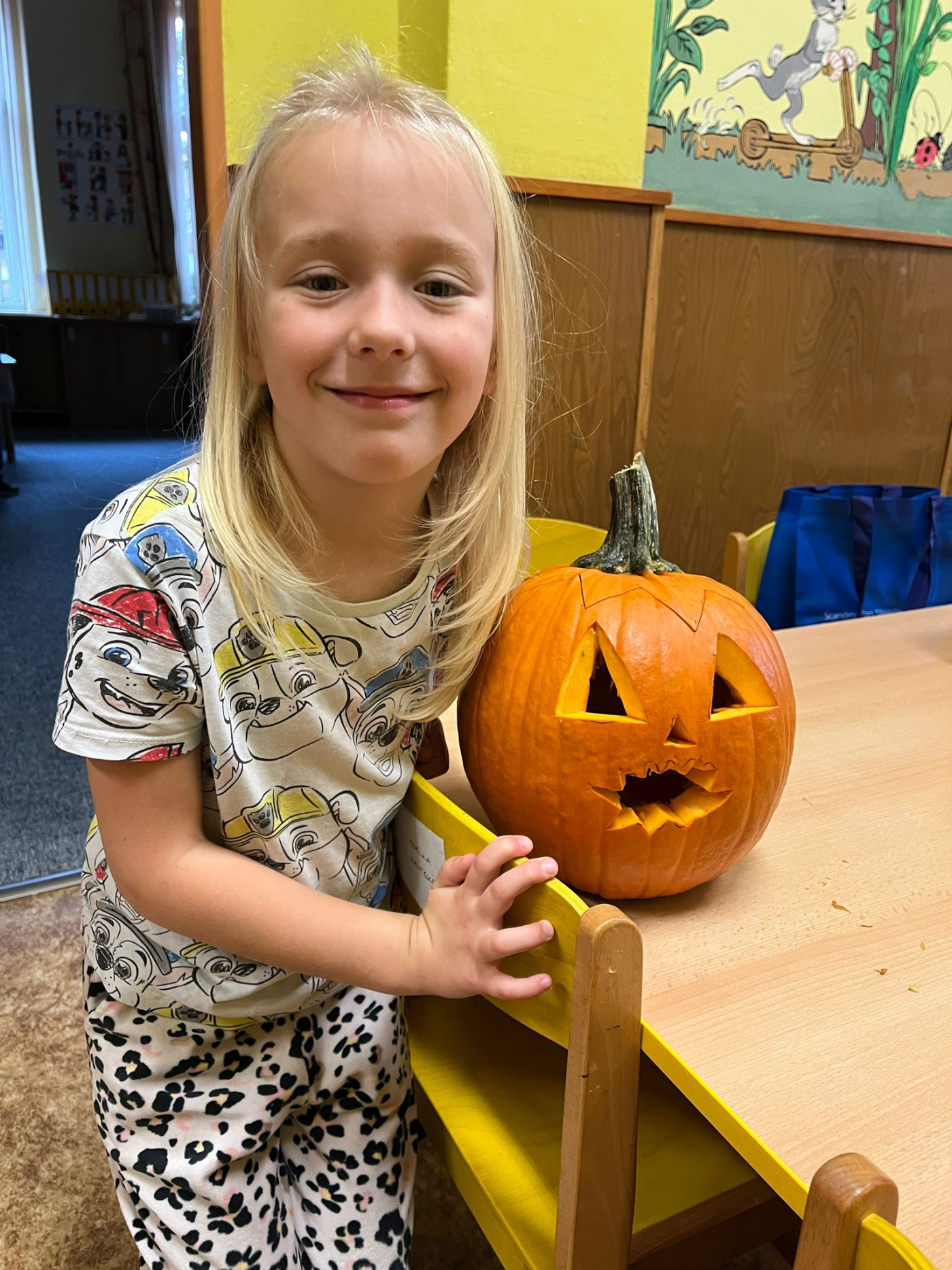 Středa 22. 10. patřila dýním. Ve školce se sešly děti se svými rodiči a sourozenci a všichni se pustili do dlabání dýní a vytváření strašidelných i veselých obličejů a dýňových postaviček. Všem se moc povedly a některé dýně zdobí i naši školku.