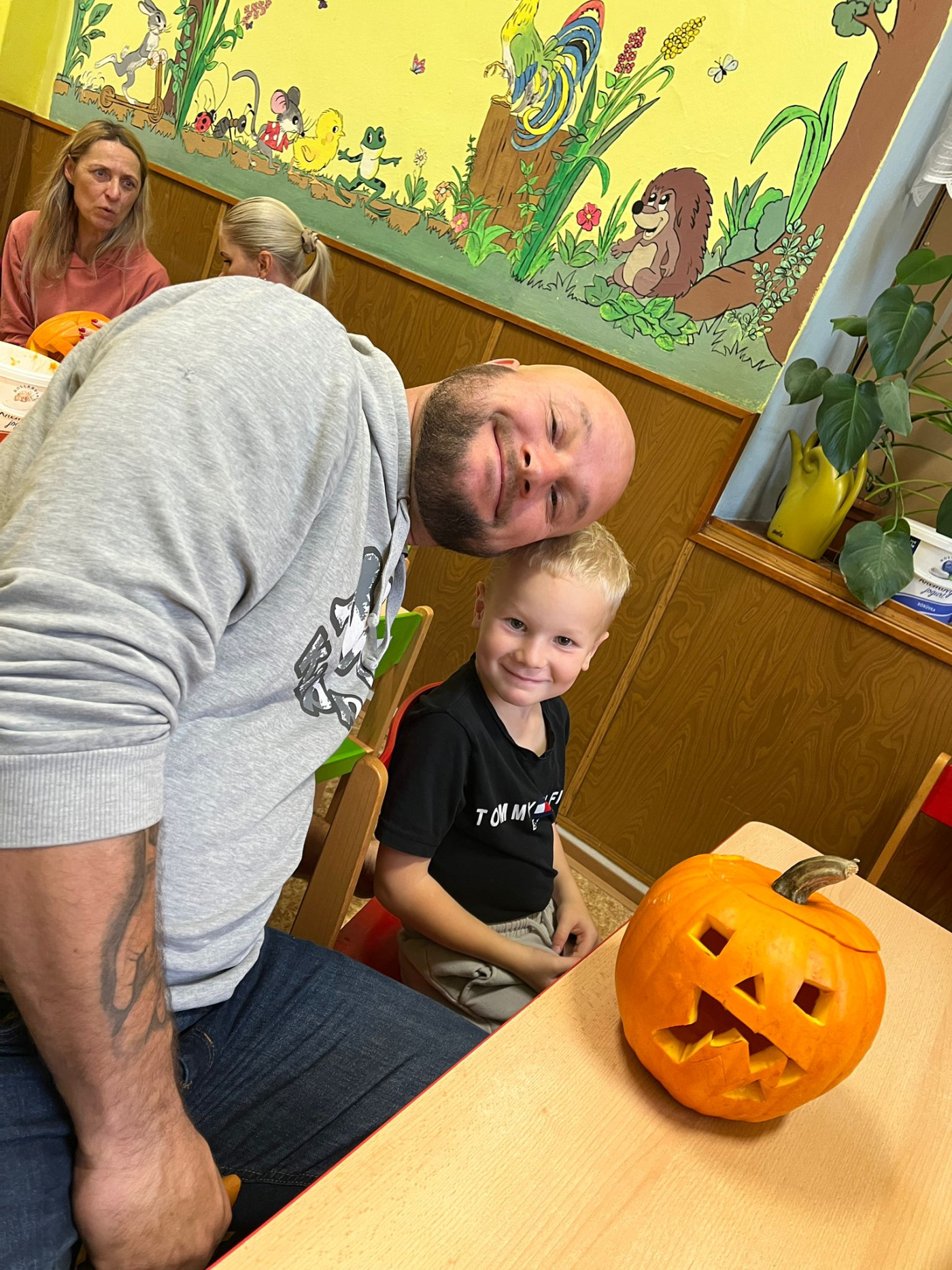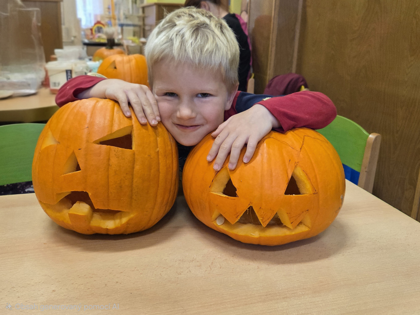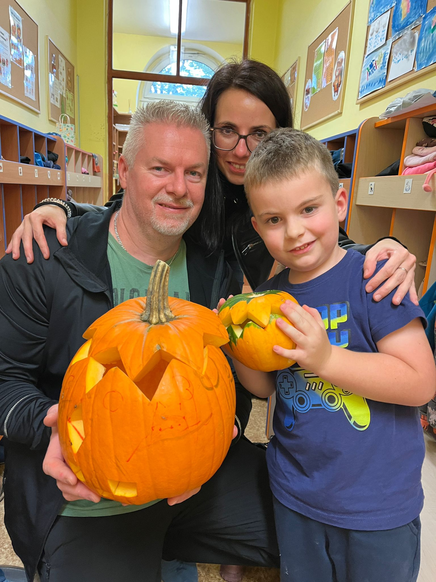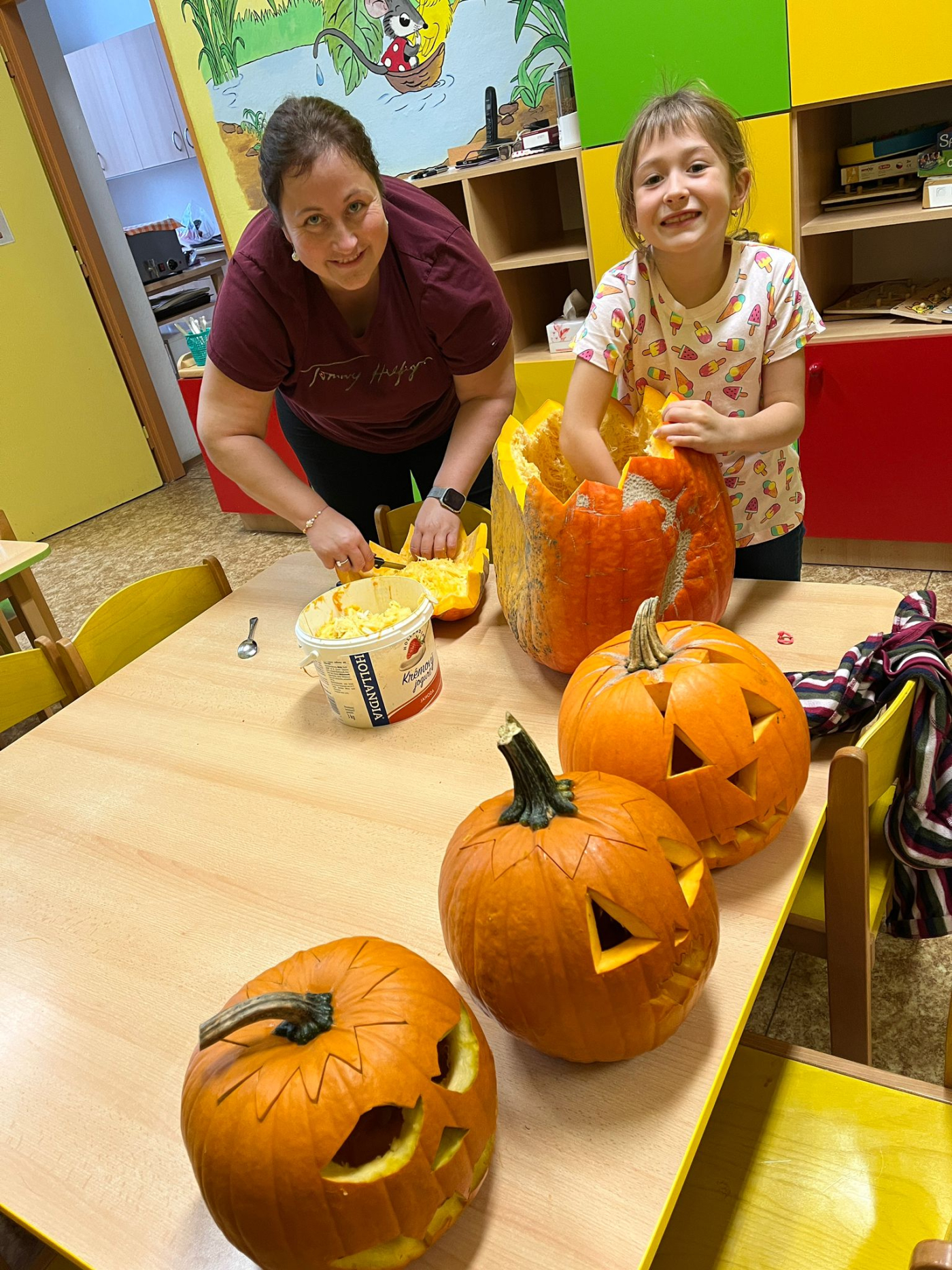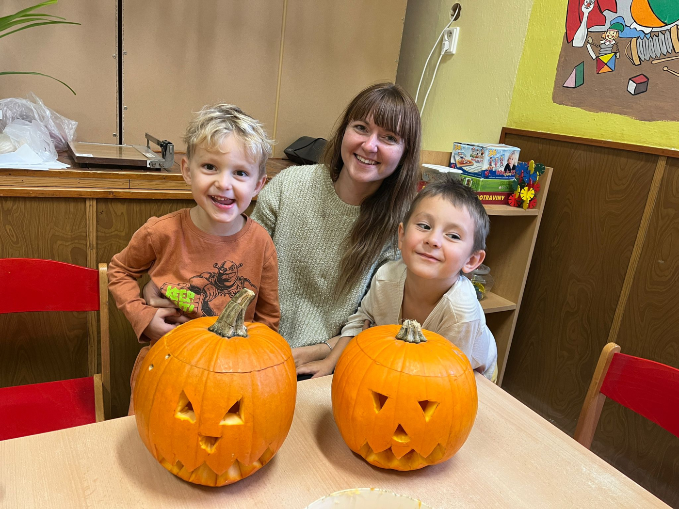Středa 22. 10. patřila dýním. Ve školce se sešly děti se svými rodiči a sourozenci a všichni se pustili do dlabání dýní a vytváření strašidelných i veselých obličejů a dýňových postaviček. Všem se moc povedly a některé dýně zdobí i naši školku.