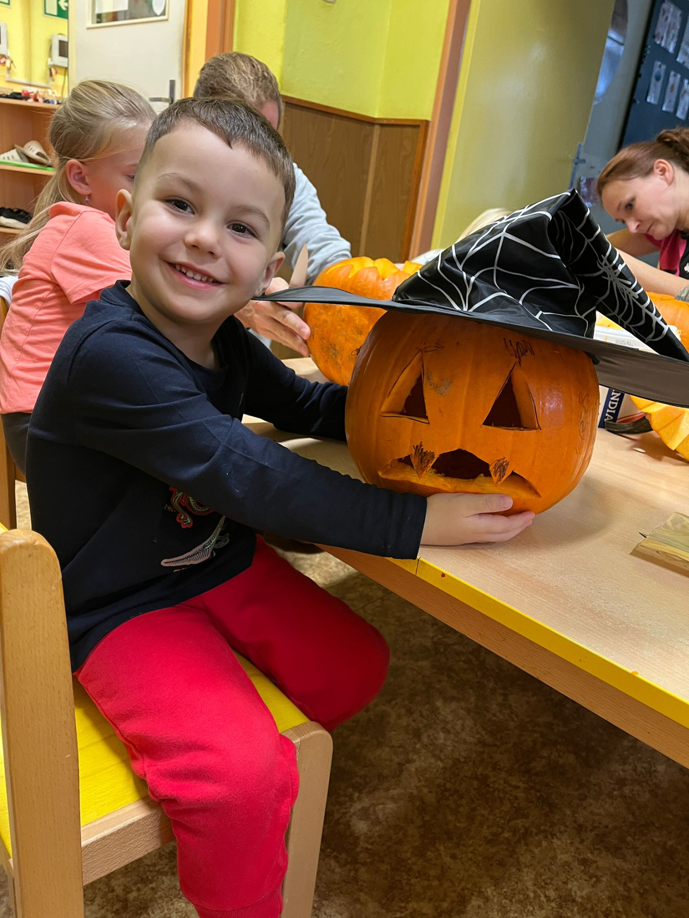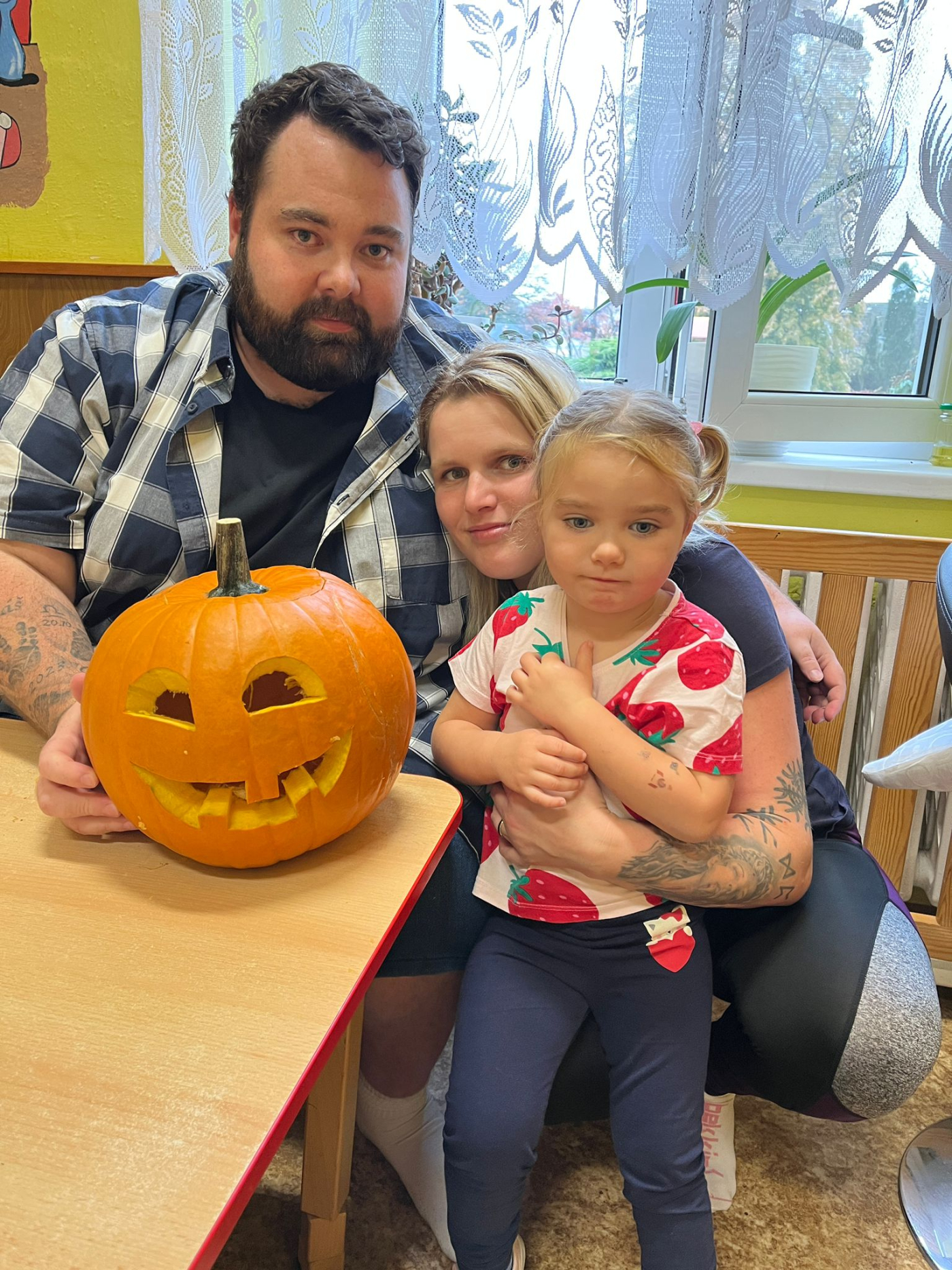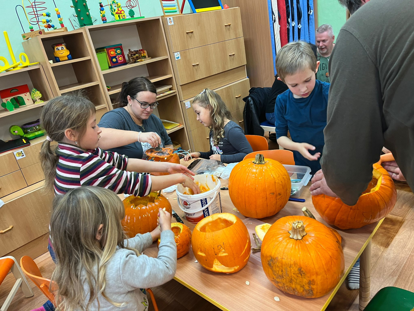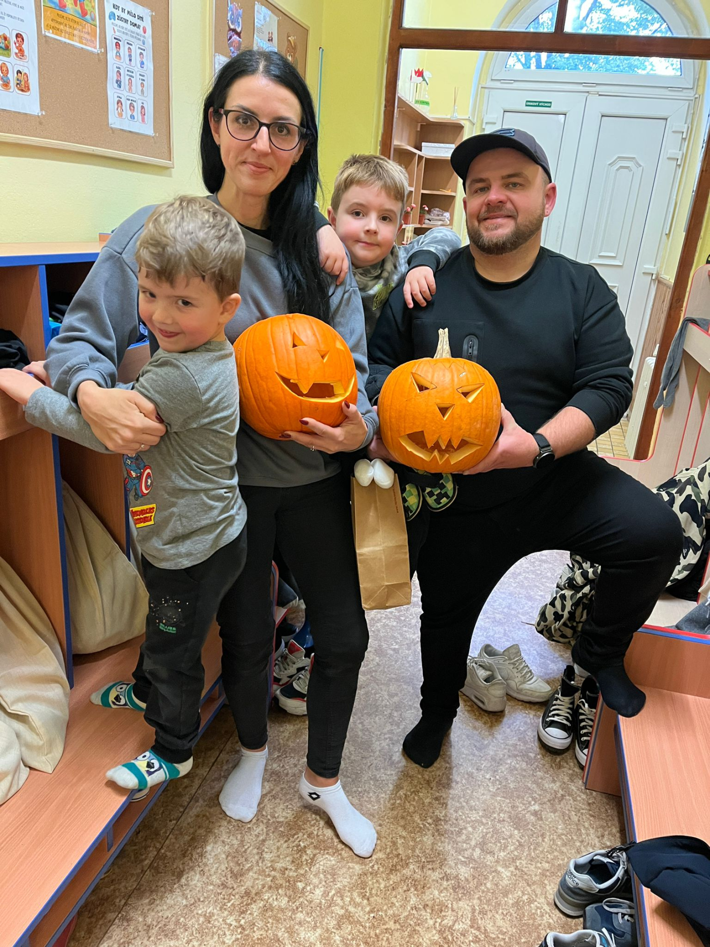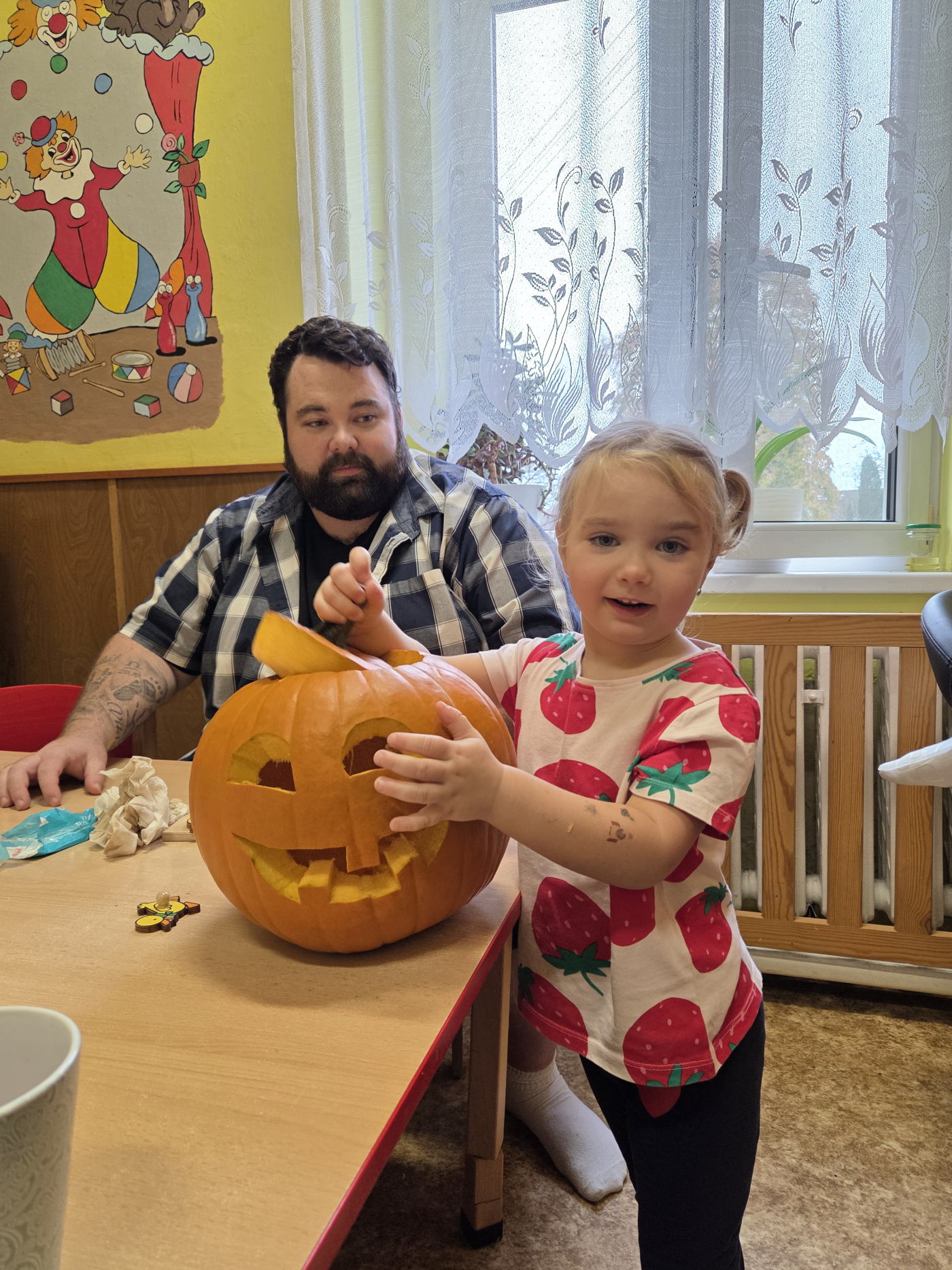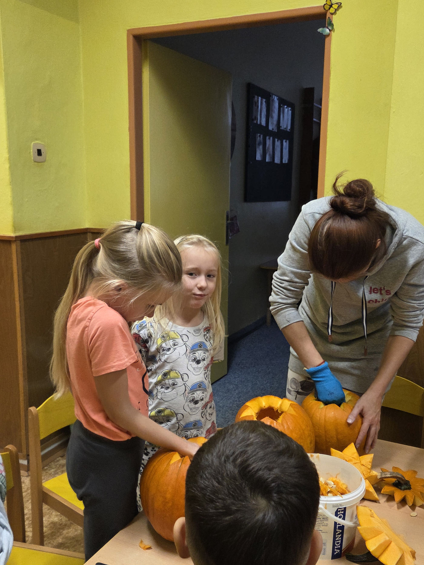 Středa 22. 10. patřila dýním. Ve školce se sešly děti se svými rodiči a sourozenci a všichni se pustili do dlabání dýní a vytváření strašidelných i veselých obličejů a dýňových postaviček. Všem se moc povedly a některé dýně zdobí i naši školku.