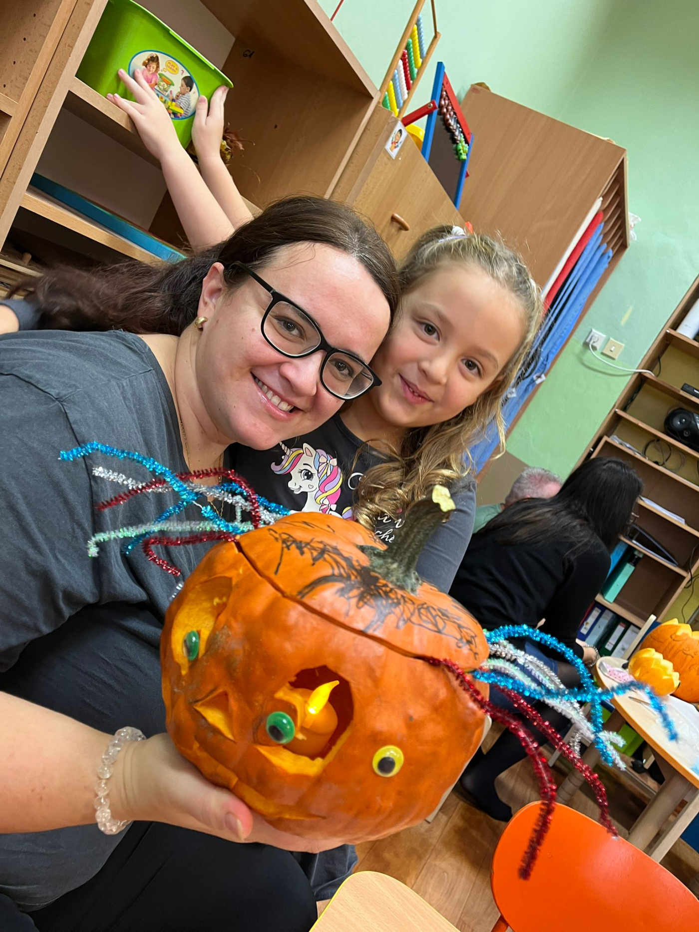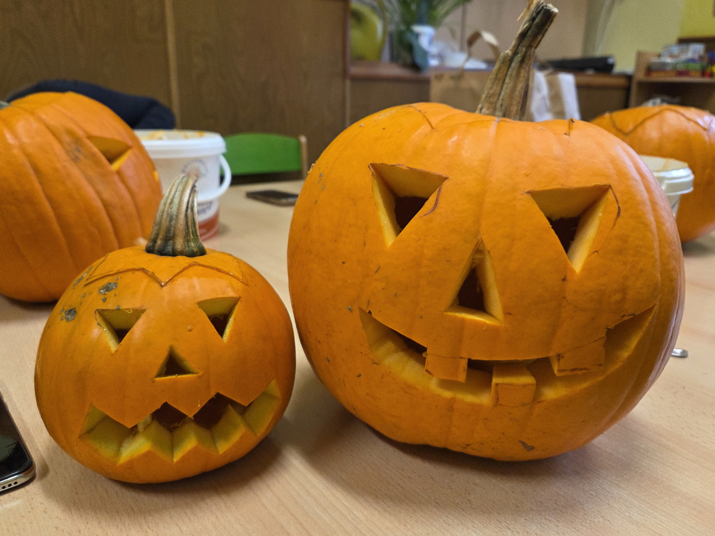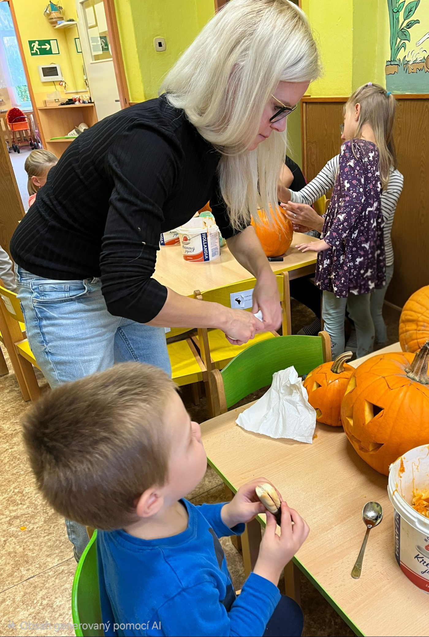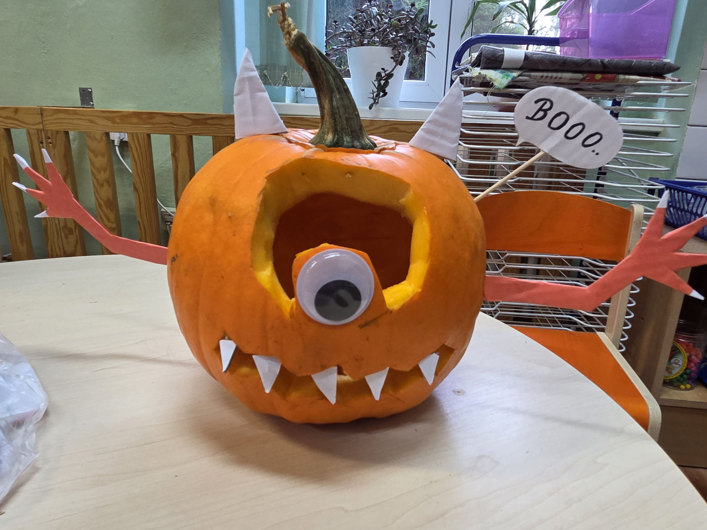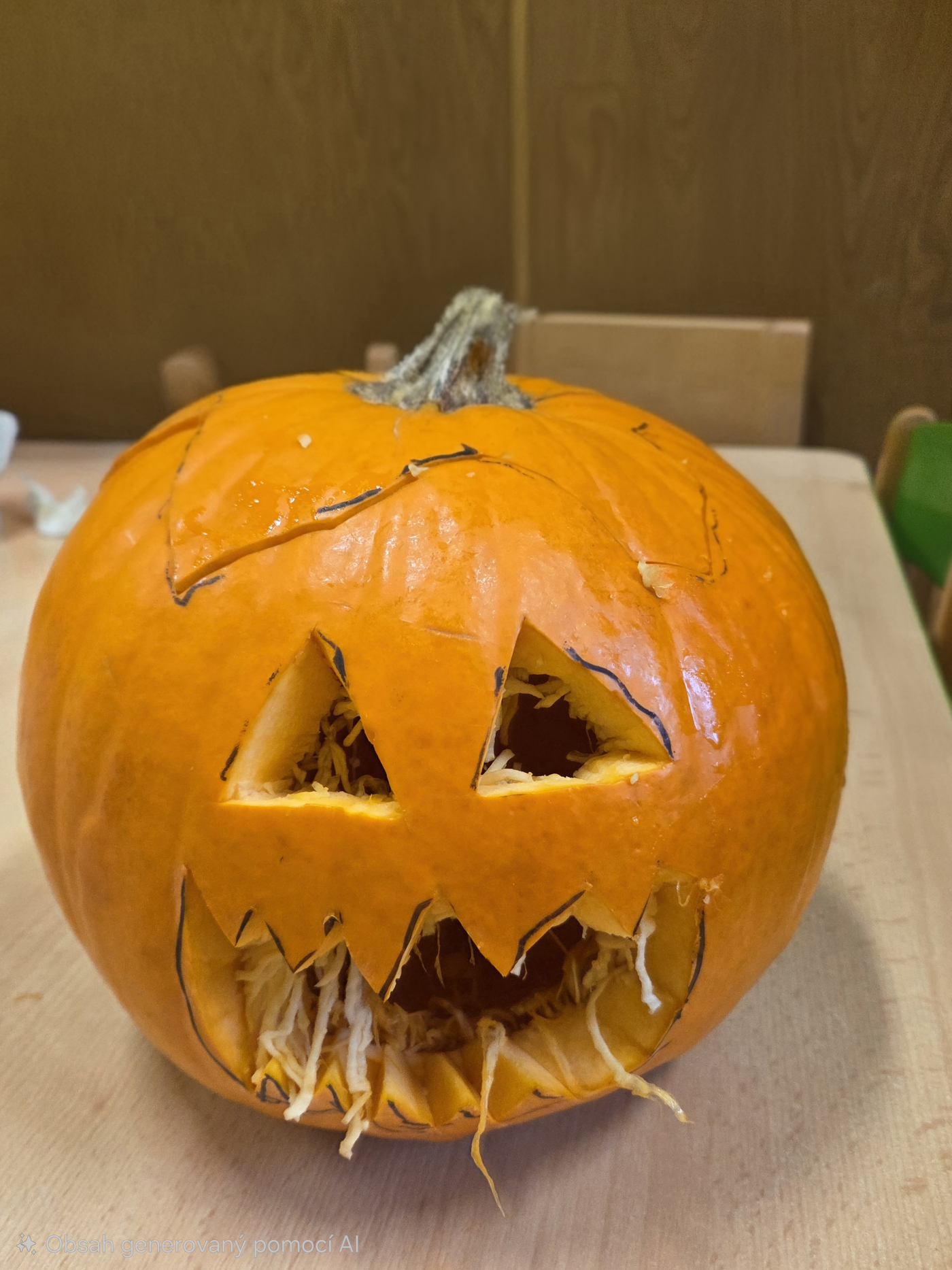 Středa 22. 10. patřila dýním. Ve školce se sešly děti se svými rodiči a sourozenci a všichni se pustili do dlabání dýní a vytváření strašidelných i veselých obličejů a dýňových postaviček. Všem se moc povedly a některé dýně zdobí i naši školku.