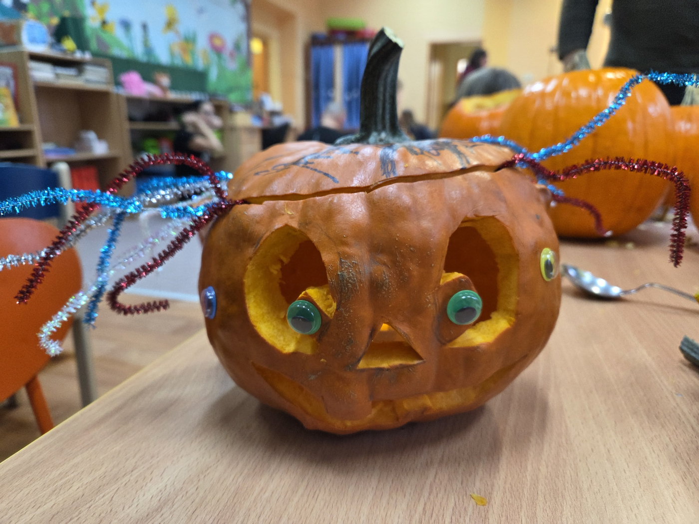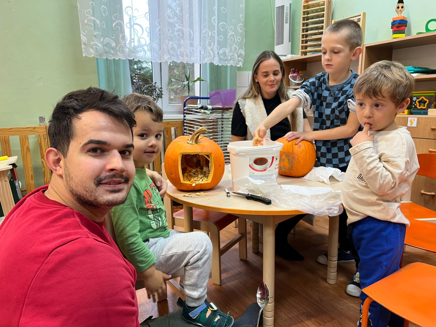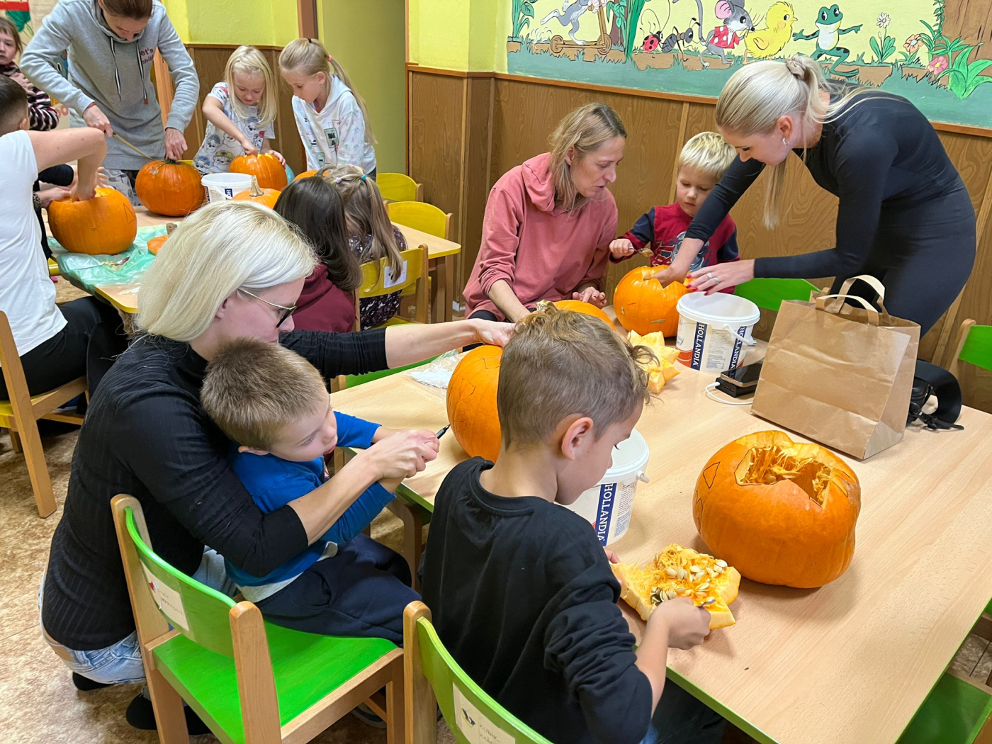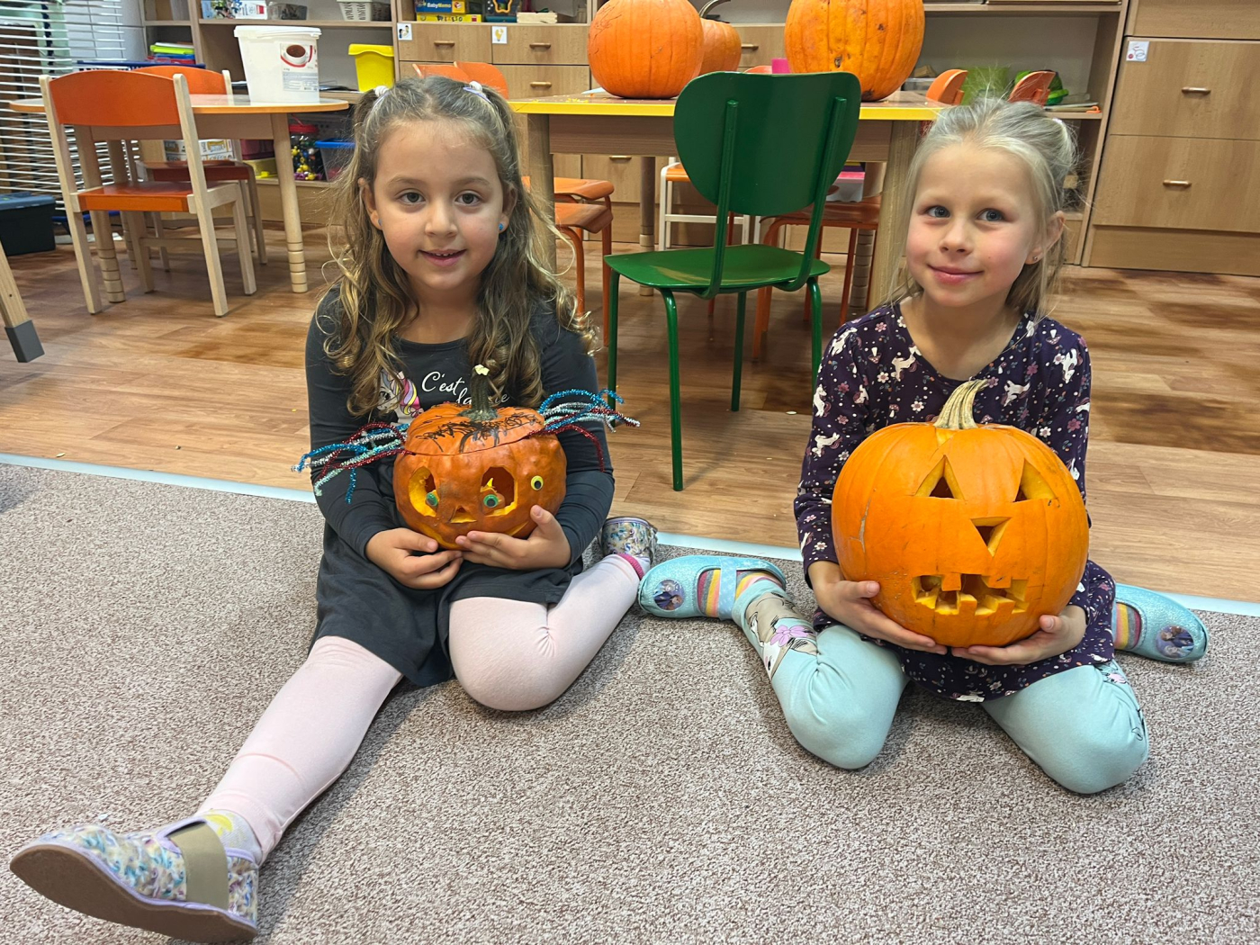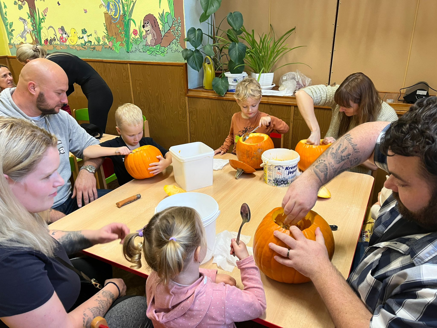Středa 22. 10. patřila dýním. Ve školce se sešly děti se svými rodiči a sourozenci a všichni se pustili do dlabání dýní a vytváření strašidelných i veselých obličejů a dýňových postaviček. Všem se moc povedly a některé dýně zdobí i naši školku.